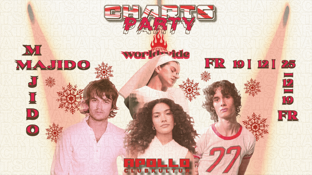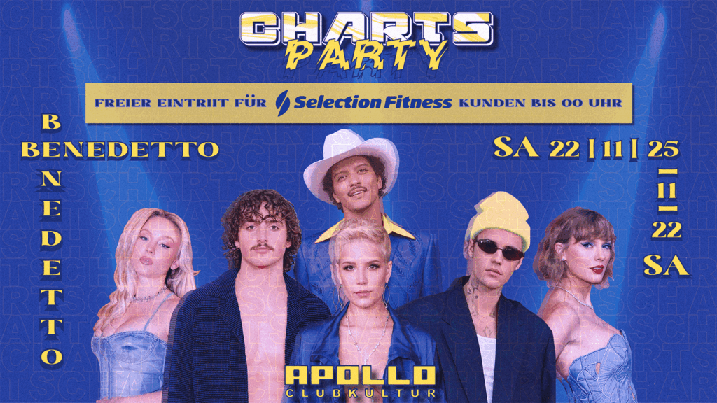 Spotify beherrscht unseren musikalischen Alltag und genau das widerspiegelt die Charts Party. Die besten und aktuellsten Hits unserer Zeit aus allen Genres vereinen wir, um euch auf unseren Tanzflächen die Möglichkeit zu geben, eure aktuellen Lieblingssongs ausgelassen mit euren Liebsten feiern zu können