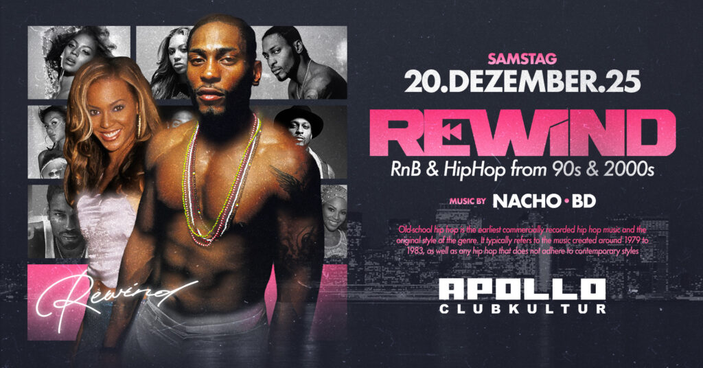 Das erfolgreiche Samstags Konzept bei uns im APOLLO für alle Liebhaber der alten Schule: Rnb & Hip Hop der 90s & 2000s. Eine Zeit in der Musik vor allem Emotionen & Leidenschaft vermittelt hatte. Ob Usher, Nelly, , Craig David, Biggie, Snoop Dogg oder Montell Jordan, Jay-Z, Dru Hill, Mario, Missy Elliott, DMX, Ja Rule und und und … Wir könnten jetzt endlos weiter machen und aufzählen.