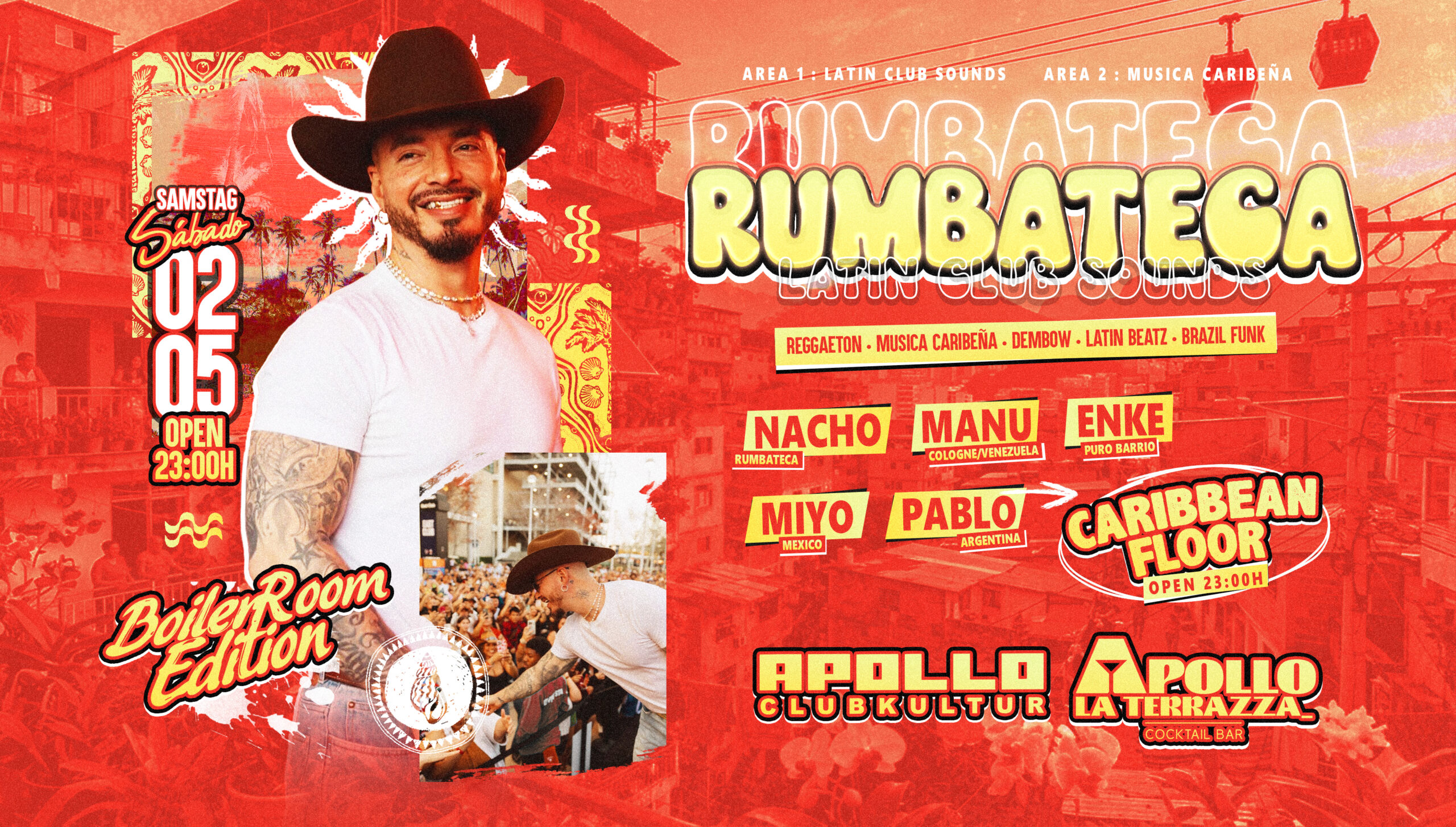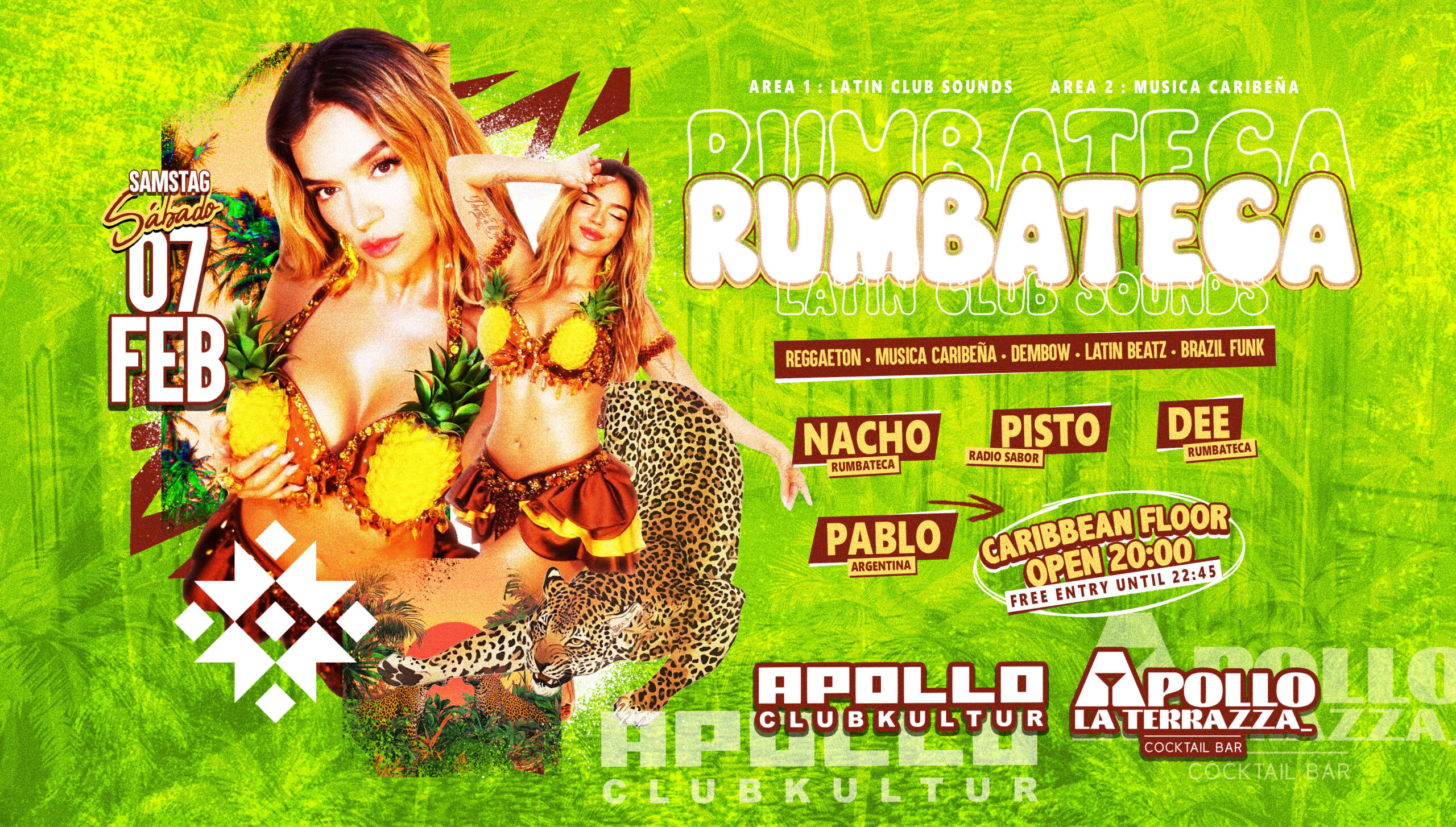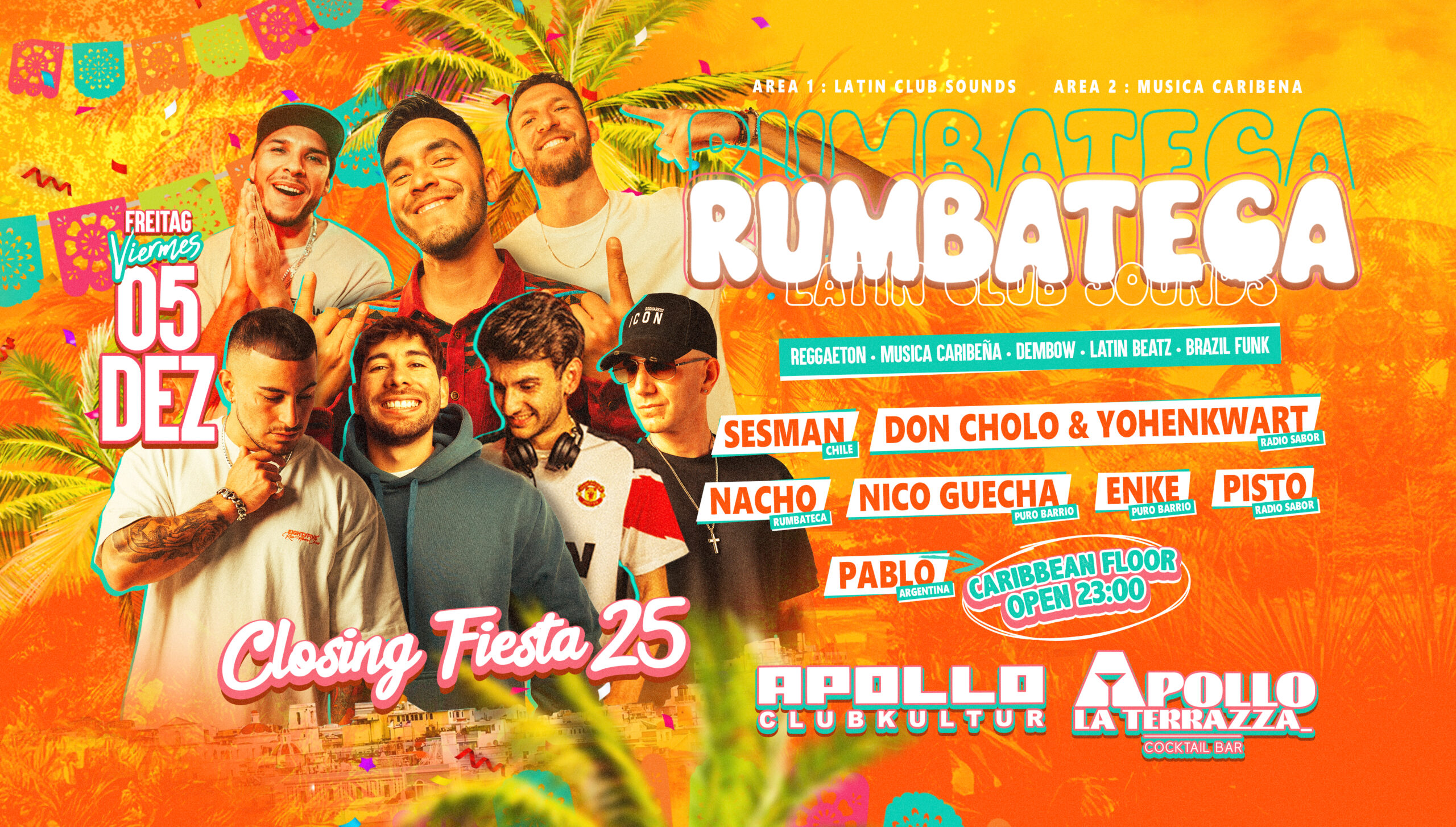 Die Rumbateca ist die #1 Latino Party, die moderne Latin Beatz mit karibischen Klängen verbindet und sie zu einem einmaligen Latin Club Sound verschmelzen lässt. Nur bei uns erhält ihr Lateinamerikanisches Lebensgefühl und erfährt mehr über dieses verrückte und explosive Nachtleben, das wir für Euch direkt ins schöne Apollo Aachen, importieren!